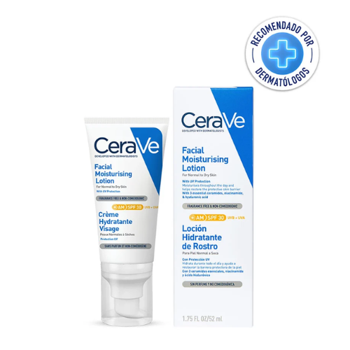 La Loción Hidratante de Rostro con FPS 30 de CeraVe hidrata y repara la barrera protectora de la piel, mientras la protege de los rayos del sol. Contiene 3 ceramidas esenciales, Ácido Hialurónico hidratante y Niacinamida calmante, además de la Tecnología MVE para proporcionar una hidratación por 24 horas. Es de fácil aplicación, y ayuda a tener una piel suave y restaurada. Fórmula no comedogénica, es decir, no obsturye los poros. Libre de fragancias y parabenos.
